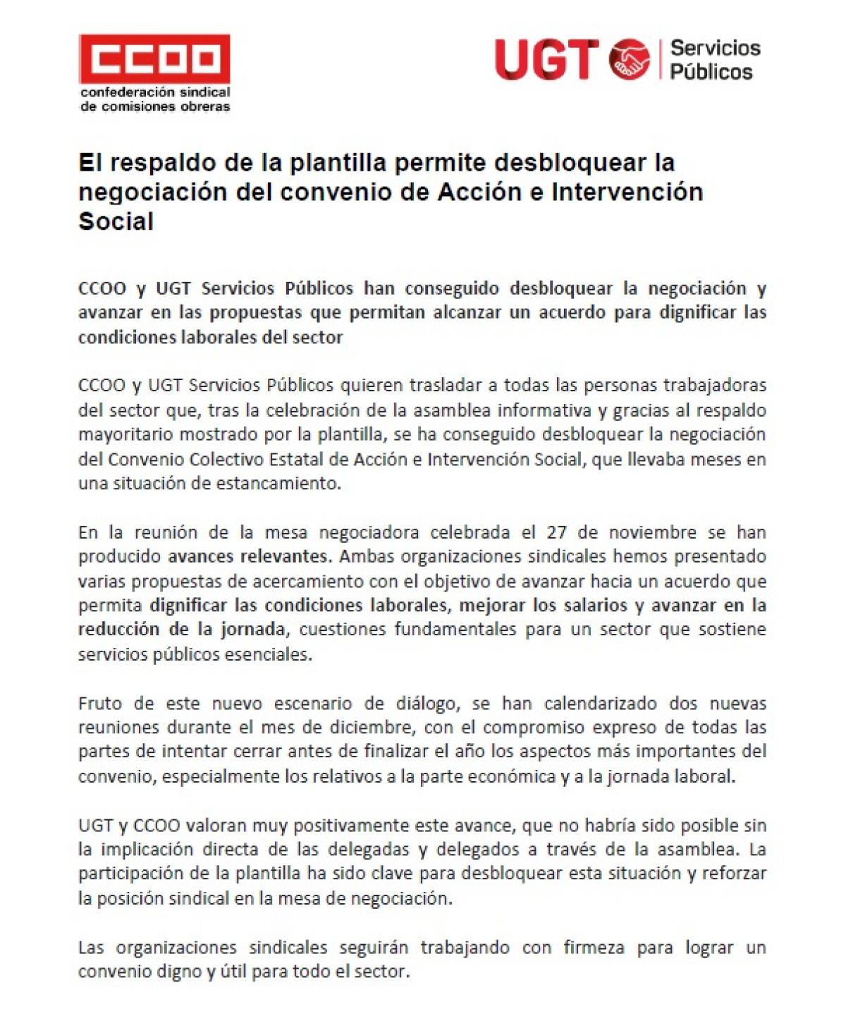 El respaldo de la asamblea permite desbloquear la negociación del convenio de Acción e Intervención Social CCOO y UGT Servicios Públicos han conseguido desbloquear la negociación y avanzar en las propuestas que permitan alcanzar un acuerdo para dignificar las condiciones laborales del sector CCOO y UGT Servicios Públicos quieren trasladar a todas las personas trabajadoras del sector que, tras la celebración de la asamblea informativa y gracias al respaldo mayoritario mostrado por la plantilla, se ha conseguido desbloquear la negociación del Convenio Colectivo Estatal de Acción e Intervención Social, que llevaba meses en una situación de estancamiento. En la reunión de la mesa negociadora celebrada el 27 de noviembre se han producido avances relevantes. Ambas organizaciones sindicales hemos presentado varias propuestas de acercamiento con el objetivo de avanzar hacia un acuerdo que permita dignificar las condiciones laborales, mejorar los salarios y avanzar en la reducción de la jornada, cuestiones fundamentales para un sector que sostiene servicios públicos esenciales. Fruto de este nuevo escenario de diálogo, se han calendarizado dos nuevas reuniones durante el mes de diciembre, con el compromiso expreso de todas las partes de intentar cerrar antes de finalizar el año los aspectos más importantes del convenio, especialmente los relativos a la parte económica y a la jornada laboral. UGT y CCOO valoran muy positivamente este avance, que no habría sido posible sin la implicación directa de las delegadas y delegados a través de la asamblea. La participación de la plantilla ha sido clave para desbloquear esta situación y reforzar la posición sindical en la mesa de negociación. Las organizaciones sindicales seguirán trabajando con firmeza para lograr un convenio digno y útil para todo el sector.